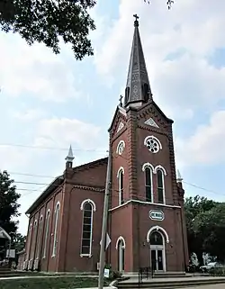 The four buildings that form the parish complex sit across the street from each other and visually form a unified complex.[8] Their exteriors are all composed of dark red brick, although the convent has subsequently been covered in vinyl siding. The church was built in the Romanesque Revival style, with a rectangular plan, decorative brickwork and a central bell tower that rises 135 feet (41 m).[1][3] The exterior features corbelling and brick pilasters on the sides that frame the tall narrow windows, which are capped by plain round-arched hoods. There is a concentration of ornamentation on the upper portion of the tower. It includes gablets with cross finials, round-arched louvers in the bell-chamber and small oculi that are placed halfway up the spire.[8]
