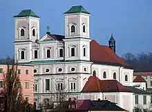 The Jesuits built a church in 1612, which was destroyed in the city fire of 1662.[2] Much of the town including the cathedral was burned down in this fire.[3] Between 1665 and 1678 the Jesuits built St. Michael's Church, designed by Pietro Francesco Carlone, the architect of the Church of St. Ignatius, Linz.[2] The Jesuits were supported in their construction work by Sebastian, Count von Potting und Persing, Prince-bishop of Passau.[4] The church is on the north side of the Inn River, just before it joins with the Danube.