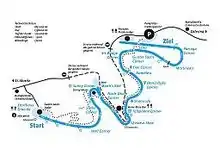 The track, with 19 curves, is 1,722 meters long with an elevation difference of 130 meters and an average grade of 8.14%. The curves were given most of their names by the British and remain to this day.[3]