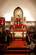 From 2004 to 2006, a local artist, Mary Jane Miller, produced icons in the traditional Byzantine art style following the traditions of icon writing.[11] The icons were created at the nearby William King Museum of Art.[12] The collection totals twenty-two icons, eighteen of which depict important events in the life of Jesus Christ, three of which depict events in the life of Mary, mother of Jesus, and a recent addition was included titled "The Mystical Supper."[12] Although the icons are venerated in Eastern Orthodox Churches, as a protestant church, St. Thomas Episcopal Church uses the icons to teach about the life of Jesus Christ.[11]