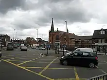 St Agnes Church began as a church room in Cotteridge, when it was licensed as a mission of St Nicolas' Church, Kings Norton in 1898. In 1902 work started on a new building to designs by the architects Cossins, Peacock and Bewlay and in 1903 the new church was consecrated. In 1916, when the living, in the gift of the Vicar of Kings Norton, became a vicarage, the church was assigned a parish out of St Nicolas' Church, Kings Norton. The parish of Holy Cross in Billesley, was assigned land from Cotteridge in 1937.[2] The church became St. Agnes Parish Church. This, along with the United Reformed Church, were demolished for the construction of a supermarket and residential properties for elderly people.[3] These two were merged with the Methodist church whose buildings were extended and still stands at the end of the Pershore Road. The church is now known as The Cotteridge Church.