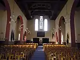 The interior is dominated by a large nave with seating for around four hundred and twenty. There are no balconies. Two arched aisles run between the nave and the side walls.