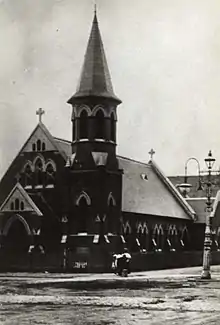 The first church building, a Gothic style wooden hall, was formally opened on 22 January 1885 at the south-eastern corner of Swan Street and Burnley Street, adjacent to the present Burnley railway station.[2] This building served both as a Sunday school hall and place of worship, and was served initially by clergy from neighbouring St Stephen's Church, Richmond.