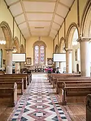 The interior underwent a major refurbishment in the 1870s. In 1871 the original Georgian box-pews and benches were replaced by the present ‘Neo-Norman’ pews, arranged in four blocks divided by a newly tiled nave and two newly positioned side aisles. The West Gallery was taken down in 1876. The refurbishments were the work of Edward George Bruton (1826-1899), an Oxford-based architect who specialised in ecclesiastical commissions in Oxfordshire and Buckinghamshire and were largely paid for by members of the wealthy Morrell brewing family[15] of Headington Hill Hall.[16] The Morrells were closely associated with St Clement's for much of the 19th and early 20th centuries and were significant benefactors to the church and parish.