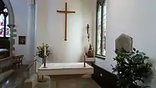 The entrance from the west tower has a round-arched doorway leading into a vestibule with two flights of stairs. A pointed-arched doorway separated the vestibule from the nave and lesser doors lead to the north and south aisles. The nave has a six-bayed south arcade with Doric columns decorated with lion masks. There is a pointed arch in front of the sanctuary with a stone rederos and the east window designed by C.E. Kempe installed in 1879. It depicts the Crucifixion, the Resurrection and the Assention. The west wall is decorated with the coat of arms of George I of Great Britain.