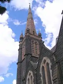 St Ignatius' Church was designed by English born architect William Wardell who had already made a name for himself in England and was also responsible for many of Melbourne's most important early buildings including St Patrick's Cathedral. Like St Patrick's it is in the Gothic Revival style and constructed from local bluestone. The foundation stone was laid on 4 August 1867.[1] The members of the predominantly Irish working class parish managed to save £700 towards construction, a large sum at the time. Stage one of the church was completed in 1927. This was made up of the nave and part of the tower and allowed services to commence.