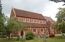 The church was founded on 18 April 1836 with the first church building being completed in 1838.[1] It was constructed on top of a hill, made of brick with lead ridging, iron and lead gutters, rainwater pipes and two iron chimneys. The building had a tower with a brick spire, which had an iron bar on top but no lightning conductor. At 5pm on 12th June 1875, the spire was struck by lightning and needed to be demolished, but the tower and the rest of the building was unscathed, as was a tree in close proximity to the tower.[2] However, the branches of some trees further away needed to be removed as they had been damaged by stones flying from the lightning-struck spire.[3] To make the tower waterproof following the demolition of the spire, a small hipped roof was added.[4]