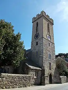 The church consists of nave with north and south aisles, a chancel and a western tower. The original church was said by local tradition to have been at the east end of the town, and its foundations were visible in the old churchyard in 1845. Destroyed by the French in their raid of 1377, it is said to have been rebuilt on the present site only to be again reduced to a ruin in 1543. At the beginning of the 17th century it was practically rebuilt, and reconsecrated by John Davenant the Bishop of Salisbury on 11 March 1626. The chancel, which had a polygonal roof with enriched bosses at the intersection of the ribs, was lengthened by 12 ft. in 1889.