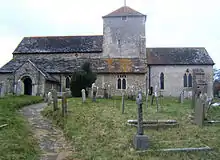 Until its collapse in 1618, the tower was much taller and ended in a parapet. The reconstruction shortened it (making the upper windows smaller) and added a Sussex cap—a shallow pyramid-shaped slate roof common in Sussex.[13] The date was commemorated by an inscription on the north wall.[12][13] The church's original entrance doorway has been retained in the south porch: it has a round arch carried on chamfered shafts with Norman-style capitals.[5][13] The detail on the stonework, although characteristic of the Norman period, is more intricate than usual.[7] The arch has a hood mould, which sits clear of the abaci at the top of the shafts.[13] Inside the doorway is an ancient stoup for holy water, which is now in poor condition.[6][14] The other doorway, in the west face, is similar to its south-face counterpart, but is more likely to be 15th-century than 12th-century.[3][13] Buttresses seem to have been added around the tower at some point during the 17th century,[11] and a large buttress remains on the south side of the chancel. This was thought to be hollow until it was analysed properly in 1948 when pebbledashing was removed from the exterior.[13]