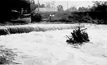 The construction of the weir, according to the council minutes, was designed by the council's Civil Engineers Department which was a concrete and reinforced steel structure. The creation of this lake proved very popular with the community as many social functions were held as recorded in the newspapers. Those activities were swimming, canoeing, various games of sport and picnics. As part of this two small bathing boxes were erected as change rooms on the flat area close to the edge of the top of the bank. In 1931 a devastating flood in Enoggera Creek occurred under-mining the supporting earth bank at the west end of the concrete weir wall, reducing the water-retaining capacity of the wall and was not able to serve its design purpose – as well the bathing boxes were washed away and were not replaced. History has not recorded the outcome of the weir but it is believed within the community that the structure was dynamited and destroyed some time in the 1940s. The concrete across the floor of the creek which can be seen near the St Johns Wood Scout's Hall is all that remains of the original weir.[48]