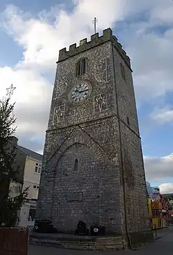 The tower is the remaining part of a 15th-century Gothic church structure.[2][1] A church had sat on this site, in the centre of Newton Abbot and the meeting point of its three main streets, since 1220 and is mentioned in a surviving document of 29 May 1350.[3][4][2] The church consisted of the tower and a small nave to the east measuring 55 feet (17 m) by 20 feet (6.1 m). The nave was described as unremarkable aside from some oak seats to the east of the font which were particularly historic.[2]