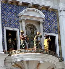 Below again, is a semi-circular gallery with statues of the Virgin and Child seated, in gilt beaten copper. On either side are two large blue panels showing the time: the hour on the left in Roman numerals and the minutes (at 5 minute intervals) on the right in Arabic numerals. Twice a year, at Epiphany (6 January) and on Ascension Day (the Thursday 40 days after Easter, counting both days), the three Magi, led by an angel with a trumpet, emerge from one of the doorways normally taken up by these numbers and pass in procession round the gallery, bowing to the Virgin and child, before disappearing through the other door.