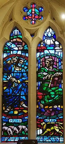 The church contains stained glass (1957) depicting St Peter and St Mark by Brian Thomas. It also contains a reredos by Sir Ninian Comper.[3]