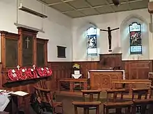 To the north of the chancel is a war memorial chapel, with the vestry on the floor above. The chapel contains an altar panel by Byam Shaw, and a carpet with a William Morris design.[2] The three-manual organ was built about 1920 by Jardine & Co. of Manchester. It was rebuilt in 2008 by Nicholson & Co. of Malvern.[6] There is a ring of six bells that were cast in 1826 by Thomas Mears II of the Whitechapel Bell Foundry.[7]