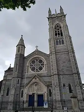 Ground for the church was broken in 1835 and the church was blessed in 1839 by Archbishop Daniel Murray.[1] At the time it had an earthen floor, no ceiling and no internal plastering.[1] Internal plastering was completed in 1842, a passage was added on the east side of the church in 1844 and wooden flooring replaced the earthen one in 1848.[1] In 1898 the frontage was erected - the architect was J. O'Callaghan and the builder was James Kiernan.[1] The bell tower was erected shortly afterwards to a design by Walter Doolin and is known as the Lee Memorial Tower after the parish priest the Very Reverend James Canon Lee.[1]