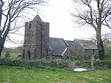 The tower has external buttresses and the door on the west side is set in a pointed arch frame with a hood mould.[3] The buttresses and door were added to the tower after it was built; the 1937 Royal Commission survey described them as "modern".[10] There are two stages (levels) to the tower; the tall upper stage is slightly narrower than the base, which measures 8 feet 6 inches by 8 feet 9 inches (26 by 2.7 m). The tower has simple rectangular openings in the north, east and south walls.[3][10] There is a 17th-century bell in the west wall of the tower in a plain arch opening; the top of the wall is crenellated.[3][8] Behind the parapet at the top of the tower, there is a short spire in the shape of a pyramid, made from wood and covered in slates.[3][10]
