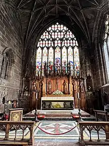 The altar table is dated 1638. In the north wall of the sanctuary is an aumbry and on the opposite wall are a canopied piscina and a triple sedilia, also with canopies.[4] These canopies are described as being "among the showpieces of the 14th century masons".[22] The reredos was dedicated in 1919 and contains carvings of Christ on the Cross, Mary and John, and the four national saints, Saints George, Andrew, Patrick and David. The canopies above them echo those of the choir stalls.[23]