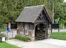 The lychgate at the northern entrance to the churchyard doubles as a war memorial and was erected by public subscription and a donation from the Mosley family in 1919. Designed by Lincolnshire architect Cecil Greenwood Hare and built in Lichfield, the structure contains a bronze crucifix and lists of those villagers killed during the two world wars.[5]:17 The pierced side panels were replaced with new versions, in oak, in the 2000s.[5]:22 The lychgate was granted protection as a grade II listed building on 26 March 1986.[12]