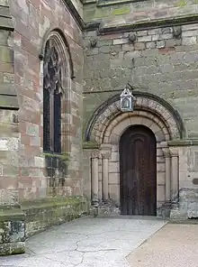The current church dates to the 12th and 13th centuries. It underwent a major restoration in 1892 by the architect Sir Arthur Blomfield.[7] The oldest surviving portion is the north entrance (unusual in a church, whose entrances are usually on the south), in Romanesque style and dating to 1130.[5]:15 The church is constructed of ashlar sandstone and consists of a nave, chancel and tower with spire. There are aisles on the north and south sides of the church.[7]