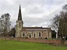The churchyard is surrounded by a sandstone curtilage wall.[5]:13 It was extensively remodelled in the 19th century with entrances stopped up, walls moved and rebuilt and new entrances formed.[5]:16[8] In 1897 Sir Oswald Mosley, 4th Baronet erected a Saxon cross in the churchyard. It had previously been used as a paving slab in the porch of St Michael's Church, Tatenhill and before that was in the grounds of Rolleston Hall.[4]:205[8]