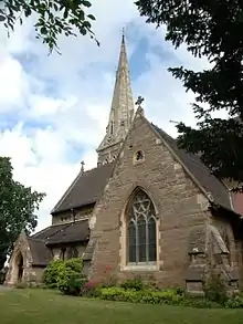 The architect Edward Holmes designed the building in a Gothic Revival interpretation of Decorated Gothic.[1][5] It is built of coursed sandstone, enlivened both inside and out by being laid in courses of two different shades.[1][5] The walls are of brick, faced externally with Bromsgrove stone, with Bath stone used for the tracery, dressings and spire. The nave, chancel and aisle arches and columns are executed in Bath stone, the arches having Weoley Castle stone voussoirs introduced alternately with Bath stone. Bands of Weoley Castle stone run horizontally around the inside of the church.[4] The chancel roof was decorated with flowers in gold and colours, painted on a blue ground between the rafters. The north-west tower has a broach spire 150 feet (46 m) high, topped by a weathercock.