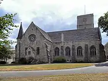 Local architects James Edward Clifton and Edmund Arthur Robinson (a son of the art curator Sir John Charles Robinson) enlarged it in 1906–08 with the addition of a north aisle and galleried transepts.[14] It is built of Purbeck stone.[15] The main entrance is at the west end of the north aisle, and has a shallow portico with a doorway in an Early English style.[16] Above that is a large window with Perpendicular tracery. An octagonal turret with stone spire adjoins the north transept.[17] A number of 18th-century monuments were retained from the earlier church.[18] The 19th-century font is Purbeck marble.[19]