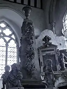 A monument to Charles Tripp (died 1624) exists in the south chapel, in the form of a tablet that is largely identical to that of another monument in St James the Great, Elmsted. A monument to Sir Thomas Palmer (dated to 1624) lies in the east of the north chapel; this was sculpted by Nicholas Stone. A monument was erected for the Oxenden family, dated to 1682 and free-standing in the centre of the south transept. A monument to a second Thomas Palmer (died 1656) exists in the north chapel; this monument was erected in 1718. A double tablet monument was erected for Streynsham Master (died 1718) exists in the north chapel. A tablet monument to Thomas Cinder (died 1719) is erected in the south aisle. A more recent monument was erected for William Miller (died 1861).[4][5]