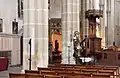 The interior has a continuous, stenciled waggon ceiling covering both nave and chancel. The high altar in the chancel is surmounted by a stenciled reredos depicting the Risen Christ with seven lamps hanging above. There is also a threefold Sedilia in the south wall of the Sanctuary. The north chapel has a stone quadripartite ribbed vaulted ceiling and an Easter Sepulchre. The South Aisle contains the organ and a side chapel at the east end, a Calvary Scene and a shrine of Our Lady of Walsingham. A set of fourteen Stations of the Cross surround the nave in both the north and south aisles. At the west end there is a Font with an intricate 19th century cover. Since 2015 the Church has hosted a contemporary art installation behind the font by the Royal Academy's Maciej Urbanek. The Work, titled 'HS', presents an abstract and subversive take on the classic image of the Holy Spirit descending as beams of light. It won the 2015 ACE Award for Art in a Religious Context.[3] The church is Grade II* listed, for its interior.[4]