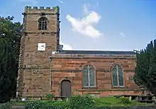 The church is built in red sandstone ashlar with a slate roof. Its plan consists of a west tower with a four-bay nave and chancel in one range. The tower has diagonal buttresses and is in three stages, the stages being divided by string courses. The lowest stage includes an arched west door above which is a three-light window and over this an empty niche. On the south face is a clock face dated 1785 inscribed with the names of the churchwardens. The topmost stage has three-light louvred bell openings on each face. The top of the tower has an embattled parapet. On the south face is a round-arched door in the west bay and three round-arched two-light windows, and on the north face are four similar windows. The east end has a round-arched three-light window.[1]