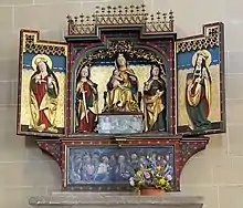 The late Gothic Virgin Mary altar (1510) in the northern side aisle is attributed to the Saalfeld School. In the shrine, the cupboard-like centrepiece, the enthroned Mother of God Mary is flanked by the standing figures of St Barbara (with chalice) and St Catherine (with sword). The figures of saints on the side wings are carved in flat relief and show St Ursula (with arrow and book) and Mary Magdalene (with ointment jar). When the side wings are closed, the Annunciation of the Nativity by the Archangel Gabriel can be seen.[1]