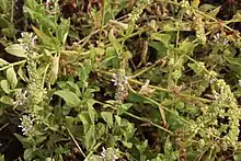 The inflorescences are 6-flowered clusters. On the flower, the calyx tube measures 4–5 mm (0.16–0.20 in) long, with the individual lobes measuring 2.5–3 mm (0.098–0.118 in) long. The corolla is a whitish, pale-pink to pink and is 8–9 mm (0.31–0.35 in) long. The corolla is labiate, with a small upper lip and a larger lower lip measuring 7.5–8.5 mm (0.30–0.33 in) long by 6–10 mm (0.24–0.39 in) wide.[2] The seeds are dark brown to black in color and measure 2 mm (0.079 in) by 1.5 mm (0.059 in).[3]
