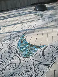 "Lotic Meander" is a serpentine walkway that resembles a dried riverbed, located outside the Ontario Science Centre's Great Hall.[31][32] Modelled on the meanderings of the Humber River, the snakelike stream is 91.4 metres long and winds along a path that takes up most of the Solar Patio.[33] The piece is made from 116 granite slabs from India, and 8 nearly perfect hemispherical or hemiellipsoidal black domes carved from boulders imported from China. The highly polished domes are similar, in appearance, to the domes used to house surveillance cameras.[34]