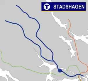 Stadshagen metro station is a station on the blue line of the Stockholm metro, located in the district of Stadshagen. The station was inaugurated on 31 August 1975 as part the first stretch of the Blue Line between T-Centralen and Hjulsta. The trains were running via Hallonbergen and Rinkeby.[2] The distance to Kungsträdgården is 3 km (1.9 mi).