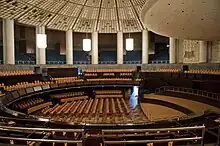 The hall was severely damaged by bombing in World War II. It was restored slightly altered, supervised by the original architect Bonatz. Changes were made to the roof and the tholobate.[5] After the founding of Lower Saxony in 1946, with the city to be the state capital, the state parliament met there temporarily from 1947 until the new building in the Leineschloss was completed in 1961.[1]