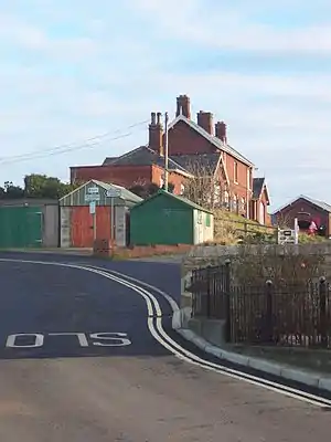 Immediately to the north west of the station the railway passed over Staithes Viaduct, built in 1875 but not opened to railway traffic until 1883 along with the rest of the railway.[10] The viaduct was built of iron and concrete and was 152 feet (46 m) high and 790 feet (240 m) in length.[12] Due to the strong winds in the area, trains could only cross at 20 miles per hour (32 km/h) in windy conditions, and the viaduct was closed completely in high winds.[13] Following closure of the line, the viaduct was demolished in 1960. A plaque near the site of the viaduct details the history of both the structure and the railway.