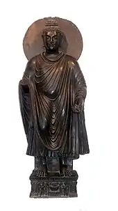 Alfred Charles Auguste Foucher especially considered Hellenistic free-standing Buddhas as "the most beautiful, and probably the most ancient of the Buddhas", assigning them to the 1st century BC, and making them the starting point of the anthropomorphic representations of the Buddha.[1]