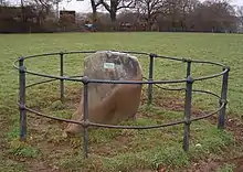 There is a boulder near to the settlement, with a plaque attached, the text reading:
