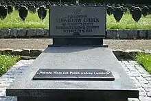 On the eve of World War II, on July 23, 1939, he was appointed commander of the Marine Brigade of National Defense and acting commander of the Land Coastal Defence. As a person of great diligence and great organizational inventiveness, he undertook active work on strengthening the defensive positions and strengthening the armaments of units subordinate to him. As a result of his activities, the number of Polish branches in the Gdynia region increased from 5,000 to up to 15-18 thousand people. The tasks set for LOW envisaged maintaining the foreground of Gdynia for 3 days, and then a 7-day defense of Kępa Oksywska as the last defense bastion. During the September campaign, Colonel Dąbek actively commanded all the land forces gathered around Gdynia by organizing offensive forays. On the night of September 1/2 and 3/4, he attacked the enemy in the Gdynia-Kolibki-Osowo area, removing his pressure from the south, and on September 6/7 and 7/8 he ordered an attack on the Nowy Dwór Wejherowski - Wejherowo axis. The counterattack of 3 battalions on the Zagórze - Reda axis was planned for September 12, aimed at pushing back the enemy forces to the north and separating their forces, ended in a fiasco due to errors in the implementation of the assigned tasks. In view of the overwhelming forces of the Wehrmacht and the cut-off of the Polish troops on the coast from the rest of the country, Dąbek decided to evacuate the forces remaining in his hands (9-10 thousand people) to Kępa Oksywska. In the evening of September 19, 1939, in the area of Babich Dołów, in the face of inevitable defeat, took his own life with a shot in the head, ordering the immediate cessation of the fight after his death. A modest funeral ceremony, after which the colonel was buried in a grave near the Quarantine Institution, was conducted by Fr. Cdr. Władysław Miegoń, the first chaplain of the Navy. On October 23, 1946, exhumations took place at the "Babi Dół cemetery", incl. col. Dąbka.[16][17] On the other hand, on October 30, 1946, the solemn funeral of the commander of the Land Defense of the Coast and his six comrades-in-arms took place.[18] On August 30, 1957, on the grave of Colonel Dąbek at the Cemetery of the Defenders of the Coast in Redłowo, a tombstone was unveiled with the words "I will show you how a Pole fights and dies".[19] A memorial plaque was unveiled in Babie Doły on September 19, 1974, to commemorate the place of the colonel's death. The colonel's wife, Irena Dąbek, participated in the ceremony. The plaque was made by the Naval Shipyard Foundry. This place is not accessible to the general public, as it is located in the 43rd Naval Aviation Base.