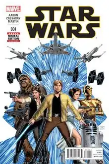 Star Wars is an ongoing Star Wars comic series published by Marvel Comics since January 14, 2015. Originally written by Jason Aaron with art by John Cassaday, it is set between the 1977 film Star Wars and its 1980 sequel, The Empire Strikes Back, much like the previous comic published in 2013 by Dark Horse Comics. The series features classic Star Wars characters Luke Skywalker, Princess Leia, Han Solo, Chewbacca, C-3PO, and R2-D2. It was one of three new Star Wars comics by Marvel announced in July 2014, along with Darth Vader and the limited series Princess Leia.