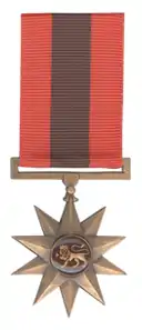 The Star for Conspicuous Leadership is a pair of five-pointed stars, superimposed one on the other and struck in bronze, to fit inside a circle with a diameter of 38 millimetres and displaying a bronze lion on a ruby red enameled centre roundel.[1][7]