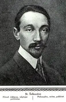 Stasys Šalkauskis (May 16, 1886 in Ariogala, Lithuania – December 4, 1941 in Šiauliai, Soviet Union) was a Lithuanian philosopher, educator, rector of Vytautas Magnus University.[1] His philosophy of culture was developed by Antanas Maceina and other philosophers.