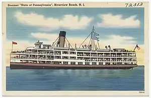 State of Pennsylvania was a steamboat that was built in Wilmington, Delaware in 1923, along with her identical sister ship State of Delaware. The steamboat operated on the Delaware River between her homeport of Wilmington and the cities of Chester and Philadelphia in Pennsylvania, as well as Riverview Park in Pennsville, New Jersey. Regular service on these routes was stopped in 1960. The boat foundered near her dock on the Christina River in 1970. In 1979, she was listed on the National Register of Historic Places.[1] In 1988, the upper decks were destroyed by a deliberately set fire, and in 2005 the hull was removed and scrapped as a hazard to navigation, all without the ship being raised.[2]