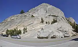 Stately Pleasure Dome is the unofficial name for the prominent south-southwestern portion of Polly Dome, a granite dome on the northwest side of Tenaya Lake and Tioga Road in the Yosemite high country. Stately Pleasure Dome consists of glaciated and exfoliated granite rock that rises steeply 900 feet (270 m) from the lake shore; the very steep east side of the dome is popular with rock climbers, who gave the dome its name.