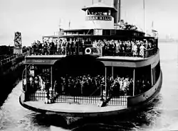 Around this time, ferry services in the area were being discontinued and replaced by bridges and tunnels, leading to the eventual demise of the 69th Street ferry.[128][129] The exception was the direct ferry from Manhattan to Staten Island,[130] which was not expected to see a significant decrease in ridership because it provided the only direct link between the two boroughs.[131] Electric Ferries' franchise for the Bay Ridge ferry expired on March 31, 1954; and the city contracted the 69th Street ferry's operation to Henry Shanks in order to keep that ferry running.[132] The 69th Street ferry ceased operation in 1964, due to the opening of the Verrazzano-Narrows Bridge a short distance south of its route.[46][133] At the time of the 69th Street ferry's discontinuation, it was being used by 7,000 passengers daily, who paid five cents each, and 8,000 vehicles daily, which were charged 75 cents apiece. Each boat could fit between 500 and 750 passengers but only 42 vehicles, which meant for traffic jams at both of the ferry's slips, due to the boats' low capacity. However, the route between St. George and Whitehall was kept open, since the bridge's opening was expected to spur an influx of residents to Staten Island, with a potential increase in commute ridership on the ferry to Manhattan.[128]