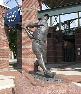 A statue of Mickey Mantle is installed outside Oklahoma City's Chickasaw Bricktown Ballpark, in the U.S. state of Oklahoma.