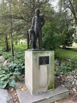 The statue of Thomas Anthony Dooley III with Lao children[1] is installed near the Grotto of Our Lady of Lourdes, Notre Dame.[2][3] The bronze sculpture measures approximately 4 ft. 3 in. x 2 ft. 2 in. x 1 ft. 6 in., and rests on a concrete base that measures approximately 4 ft. 6 in. x 5 ft. 1 in. x 4 ft. 6 in. A plaque reads: "THOMAS A. DOOLEY, M.D. '48 / 1927-1961 / Who as a pre-medical student / cherished Our Lady's Grotto / and who as a physician served the afflicted people of Southeast Asia / with uncommon devotion and dedication / Gift of the / Notre Dame Club of St. Louis / and the sculptor / Rudolph E. Torrini '59 / Dedicated February 1, 1986".[4]