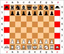It is similar to normal chess, with the exception of an extra piece and the widening of the board by two specially-colored fields (red and white are described, as opposed to the normal black and white) on either side, known as the Slurks. The extra piece is the assassin (appearing on either side of the rooks in the beginning of the game), the only piece to be able to move in the Slurk.