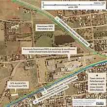 In the early days of the society, Australian National, which managed the railway facilities and operations at Peterborough, allowed rolling stock to be stored within its 19-stall roundhouse. The society saw the need to establish its own facilities, and proposed to establish its own depot on a block of land 200 m (220 yards) north of the boundary of the railways site holding the workshops and roundhouse.[note 1] Members saw it as an ideal site, since it had mains water, power and sewerage. The society also proposed that a triangle could be installed, and Australian National agreed to provide the land at a nominal rent.[19] Despite the proposal, it was not approved and a greenfield site 600 metres (660 yards) west of the roundhouse was allocated by the council.[note 2] Construction of a depot started in 1980.[20] The substantial task of laying track to connect the depot to existing track was completed in 1983.[21]