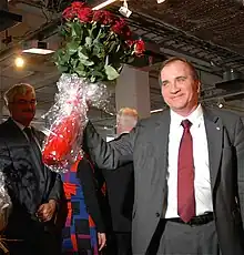 Löfven enjoys sports and supports the ice hockey club Modo from Örnsköldsvik[73] and the football clubs Tottenham Hotspur[74] and GIF Sundsvall.[75] He is married to politician and trade unionist Ulla Löfven and has 2 stepchildren.[76] Löfven himself has no biological children.[77]