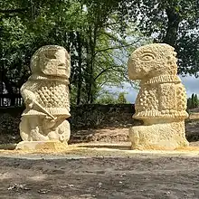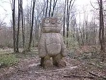 For his figurative stone sculptures Rinck uses traditional tools and techniques of direct carving.[3] He works with sandstone, limestone, marble and diabase. He finds his sources of inspiration in various epochs in particular the French Romanesque period as well as popular culture such as video games and comics.[4][5] Rinck's stone figures build a community of characters, animals, monsters and hybrid creatures endowed with symbols and cultural attributes. He uses examples from history, myths, religion and folklore as reference material[6] and places them in a contemporary context. He often deals with the issues of collective unconscious. The art theorist Bazon Brock states, Rinck adopts the figurative forms of expression of culturally collective fantasies remaining his independent language.[7] One of the key elements of his language is the humorous expression whose lightness stands in contrast to the materiality of the stone.[8] The humor has a liberating effect and helps the viewer to experience the unconscious. The cross-cultural and trans-historical communication qualities allow Rinck's sculptures to achieve universalizing ends, claims curator Daniel S. Palmer.[9] In 2019, Stefan Rinck was featured in the Thames & Hudson publication 100 Sculptors of Tomorrow. The documentary Heart of Stone by Sonja Baeger which pictures the production of Rinck's three monumental-in-size sculptures was premiered in 2021 in Berlin.